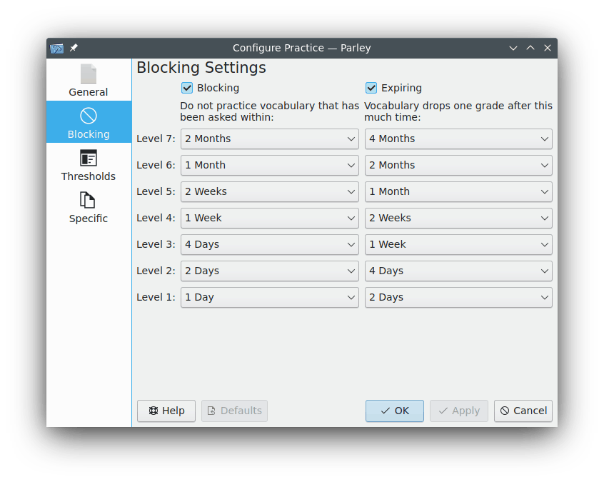 If you plan to practice your vocabulary regularly, you should make sure that the Blocking feature is enabled. Go to the Blocking page and tick the check box that says Blocking. Now you can even configure the interval in which words that you answered correctly will be repeated.