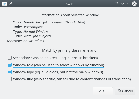Use Detect Window Properties and select the Thunderbird Compose window. Check the Window role and Window type boxes to restrict the criteria to composition windows - for additional information see window matching: