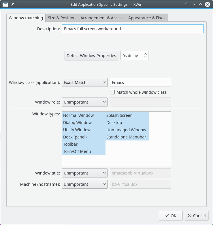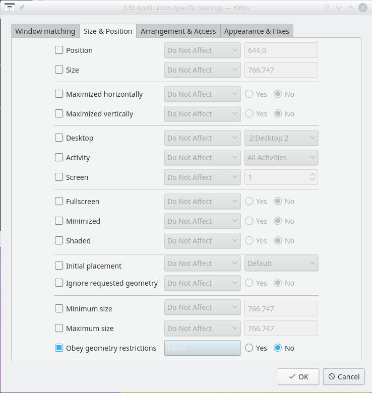 If you are unfamiliar with creating KWin Rules, see this detailed example to base your new rule.