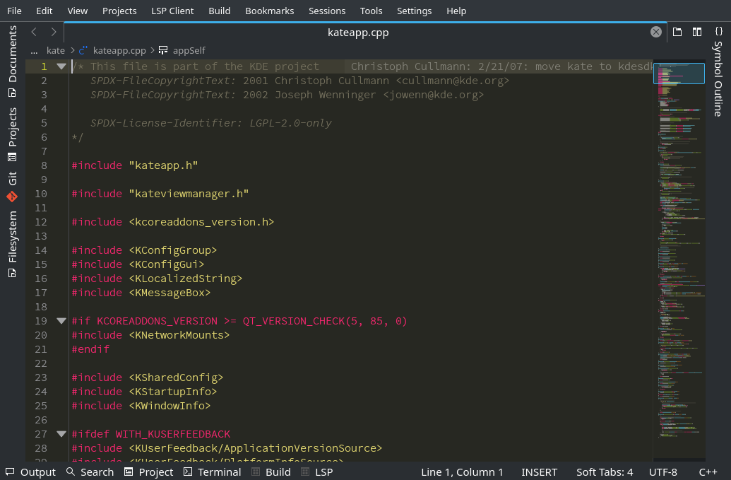 La Scrollbar-Minimapo montras antaŭrigardon de la Kate fontkodo.