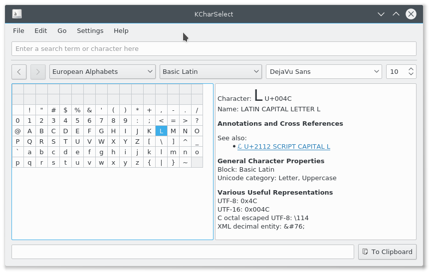 KCharSelect on tööriist erimärkide valimiseks kõigist paigaldatud fontidest ja nende kopeerimiseks lõikepuhvrisse mitmesuguses vormingus (lihttekst, Unicode või HTML).