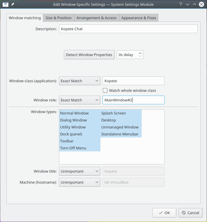 1. Use o Detectar as propriedades da janela e selecione a janela do Kopete. Corresponda apenas pelo nome da classe primário, por isso deixe as opções desligadas - para mais informações, veja a correspondência de janelas: