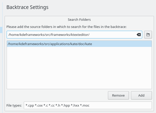 Этот модуль предназначен для разработчиков и, скорее всего, не потребуется обычным пользователям. Он отображает стек вызовов, предоставленный GDB, в виде списка в панели Kate. При щелчке по элементу списка выбранный файл будет открыт на строке с нужным номером. Этот модуль работает со стеком вызовов, сгенерированным на пользовательском компьютере, но также может работать и со стеком вызовов других людей, например, с помощью /home/dummy/qt-copy/…/qwidget.cpp. Чтобы это сработало, требуется проиндексировать каталоги, в которых находится исходный код.