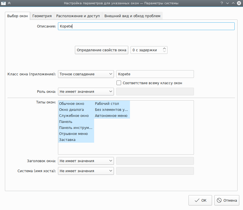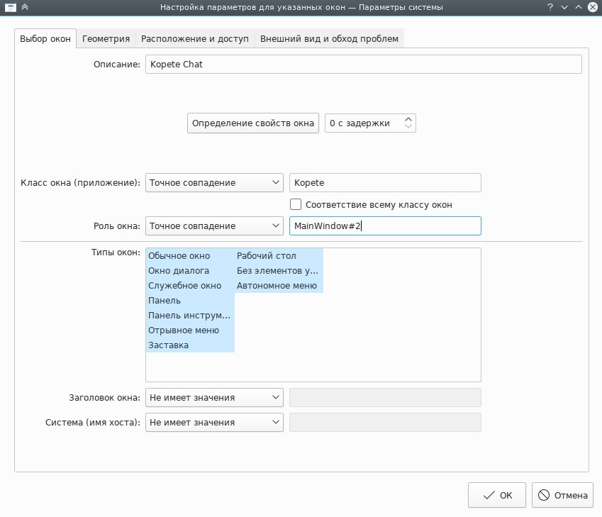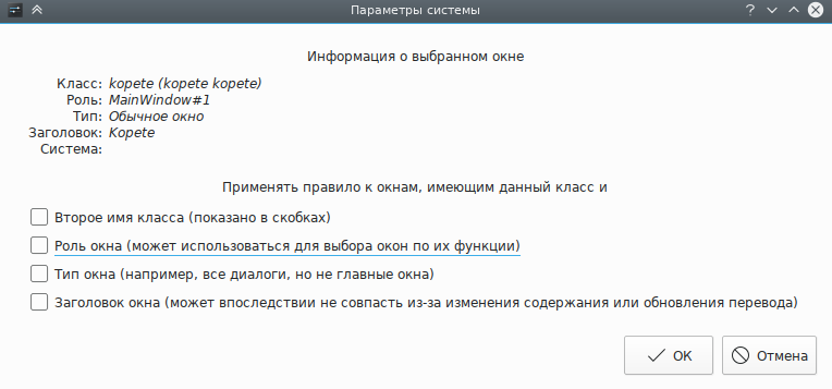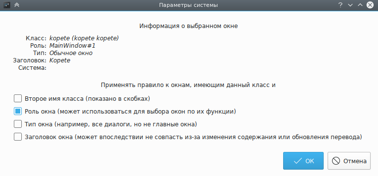 Нажмите кнопку Определение свойств окна и выберите окно программы Kopete. Задайте соответствие только по главному имени класса, оставив флажки неотмеченными (дополнительные сведения доступны в разделе Выбор окон):