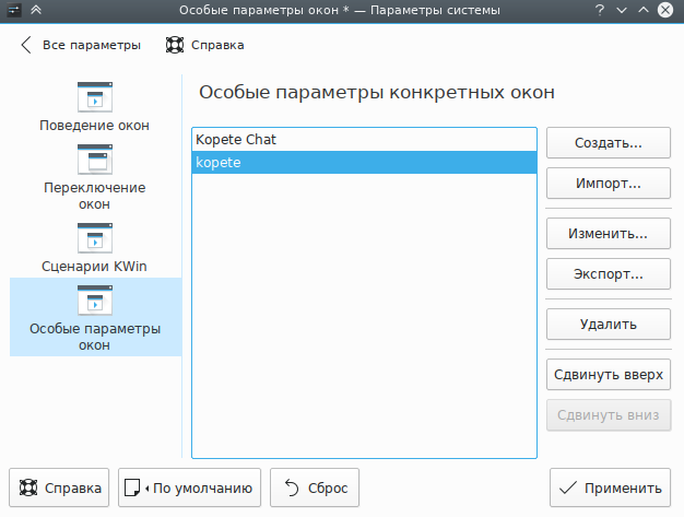 Критерии соответствия правила Окно разговора Kopete более строгие, чем правила Главное окно Kopete, так как это окно должно соответствовать конкретной роли: окно разговора. Согласно порядку процесса обработки правил правило Окно разговора Kopete должно предшествовать правилу для главного окна Kopete в списке правил KWin для программы Kopete.