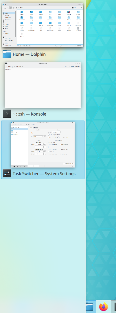 Totes les opcions descrites a les seccions anteriors funcionen juntes per a proporcionar un control molt detallat del comportament i aparença del Commutador de tasques. Per exemple, podeu definir la col·lecció d'opcions de configuració Principal perquè s'invoqui amb la combinació de tecles Alt+Tab, per a mostrar les finestres obertes en un carrusel, per a només mostrar una finestra per aplicació i per a només llistar les finestres que es troben a l'escriptori actual i a la pantalla actualment activa. Això pot proporcionar un canvi de finestra molt ràpid dependent del context si teniu escriptoris virtuals de «feina» i «casa», i després manteniu tots els vostres fulls de càlcul per al treball i la llar en el mateix monitor.