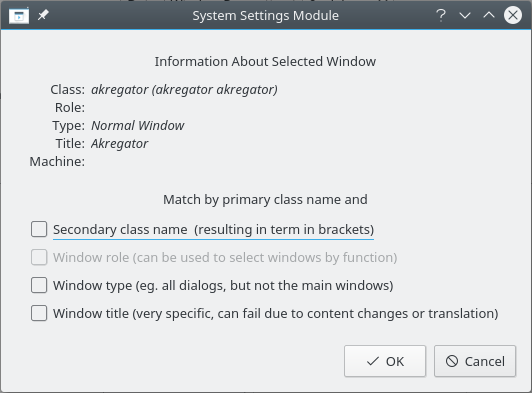 5. Feu clic a Detecta les propietats de la finestra amb 0 s de retard el cursor es convertirà immediatament en una creueta. Feu clic a (qualsevol lloc) dins de la finestra de l'Akregator (però no la barra de títol). Es presentaran els criteris de finestra. Només coincidiran per nom de la classe principal deixant les caselles de selecció sense marcar -per a obtenir més informació, vegeu Coincidència de la finestra-: