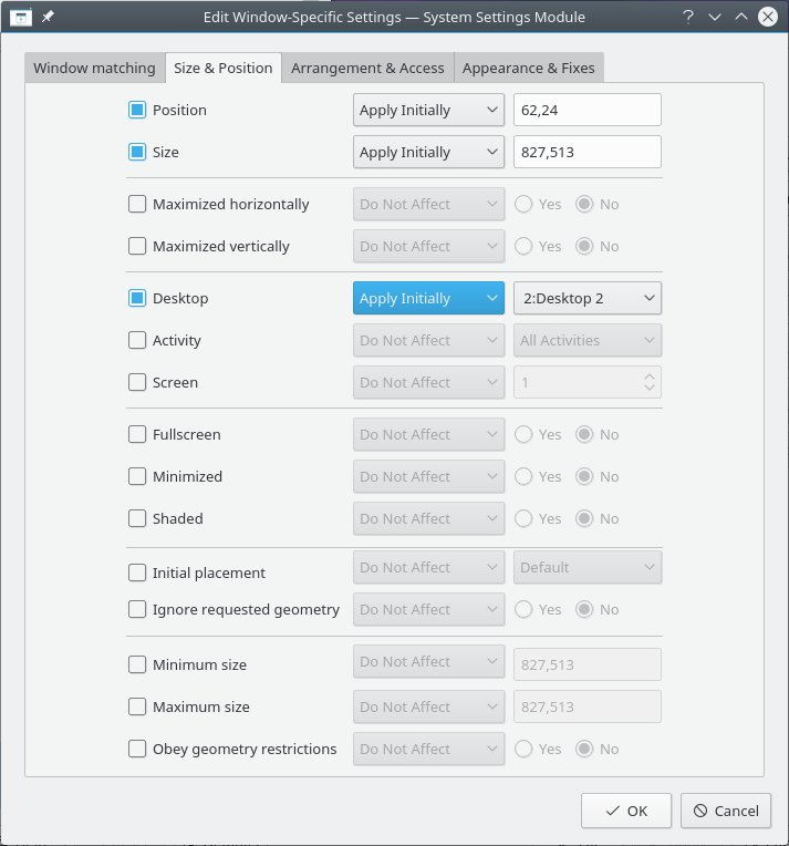 7. Activar els atributs de la finestra: Posició, Mida i Escriptori. Els valors inicials són establerts per Detecta les propietats de la finestra i es poden substituir:
