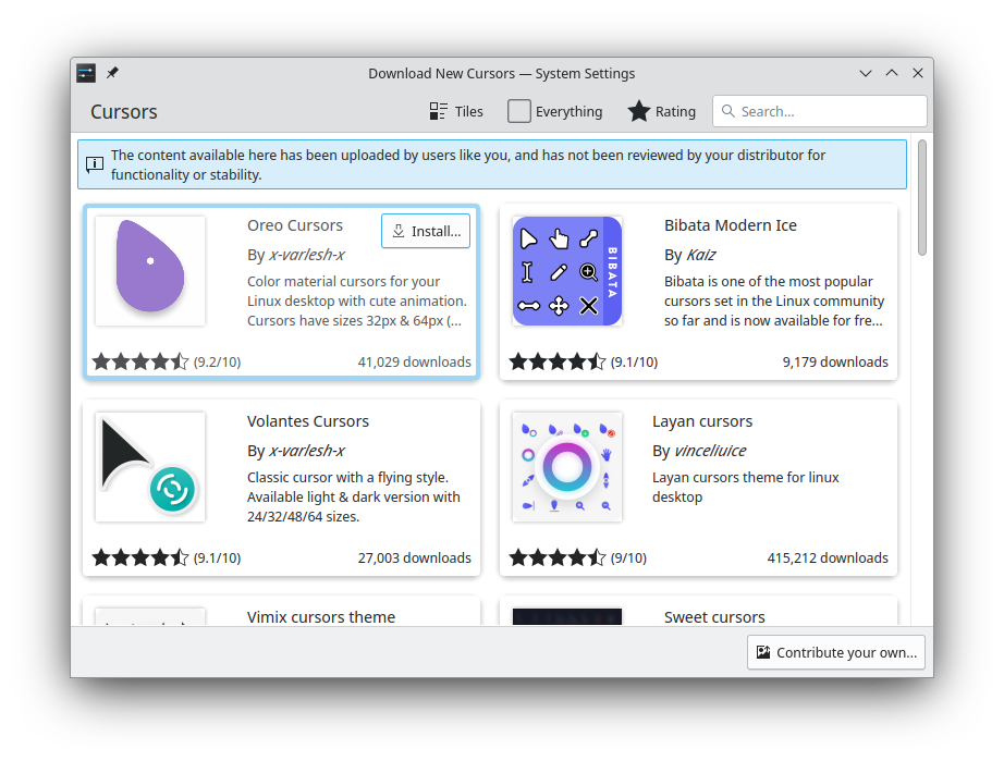 Utilitzeu el botó Obtén cursors nous... per a llançar el diàleg Baixa cursors nous i baixar temes addicionals des d'Internet.