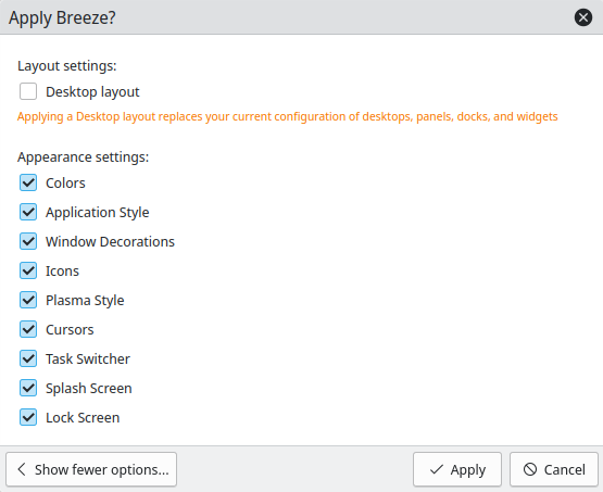 En fer clic sobre un tema global es mostrarà un diàleg que us demanarà quins components del tema voleu aplicar. Podeu seleccionar diverses opcions d'aparença i de disposició de l'escriptori.