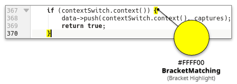 BracketMatching(Hervorhebung für Klammern)Diese Farbe wird für den Hintergrund von zusammengehörenden Klammern verwendet.