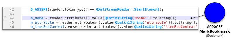 MarkBreakpointReached(Erreichter Haltepunkt)In dieser Farbe wird vom GDB-Modul ein Haltepunkt angezeigt, der bei der Fehlersuche erreicht wurde. Beachten Sie, dass diese Farbe eine Deckkraft gegenüber dem Hintergrund hat. Weitere Informationen finden Sie in der Dokumentation zum GDB-Modul.