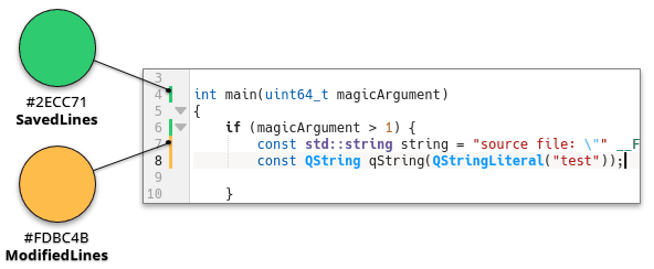 ModifiedLines(Geänderte Zeilen)Mit dieser Farbe werden links neben dem Dokument Zeilen hervorgehoben, die in dieser Sitzung geändert wurden aber noch nicht gespeichert sind. Weitere Informationen finden Sie unter „Kennzeichnung von Änderungen in Textzeilen“.