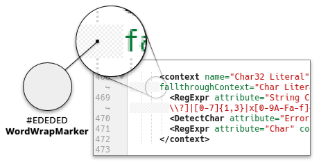 WordWrapMarker(Markierungen für Zeilenumbrüche)Diese Farbe wird benutzt, wenn am linken Rand angezeigt wird, dass Zeilen dynamisch umgebrochen und eingerückt sind, sowie auch für die Markierung von festen Zeilenumbrüchen.