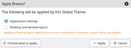 By applying a Global Theme, you can change all of the above together. You can also apply only some components of a Global Theme, such as a color scheme or a window decoration. You can choose which components to change either when applying a Global Theme, or apply individual components by using the other System Settings subsections.