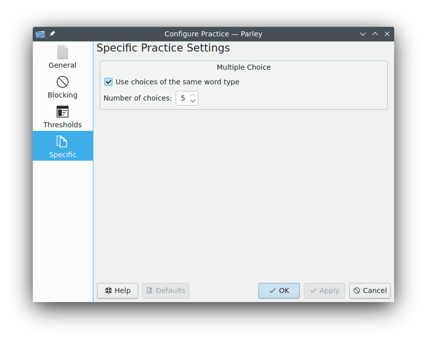 Normalmente, en el modo de varias opciones, Parley propone automáticamente una respuesta correcta y varias incorrectas. Sin embargo, para algunos ejercicios tendrá respuestas predefinidas como sí/no o algo similar. Para estos casos, tendrá que configurar la práctica seleccionando el icono