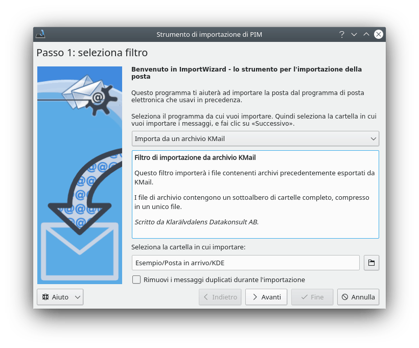 Puoi eseguire Procedura guidata di importazione direttamente dall'avviatore di applicazioni o da KMail tramite → per il riconoscimento automatico o da KMail con → per l'importazione manuale.