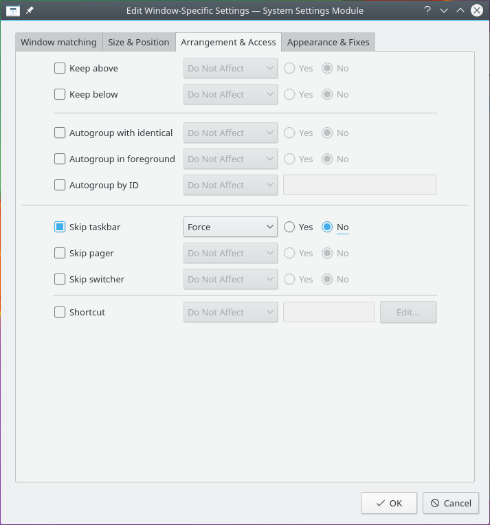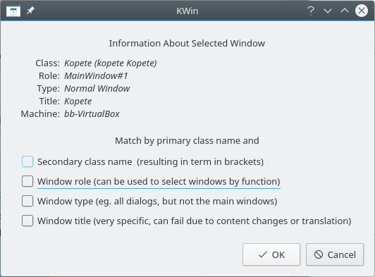 Use o Detectar as propriedades da janela e selecione a janela do Kopete. Corresponda apenas pelo nome da classe primário, por isso deixe as opções desligadas - para mais informações, veja a correspondência de janelas: