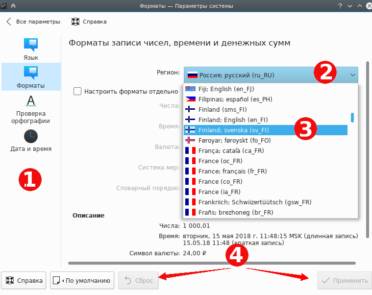 На данном снимке экрана показаны некоторые элементы графического интерфейса на примере модуля «Форматы» из программы Параметры системы. Выберите левой кнопкой мыши соответствующую часть окна, чтобы узнать о ней больше.