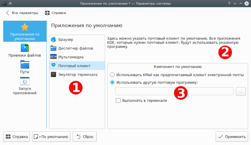 На данном снимке экрана показаны некоторые элементы графического интерфейса на примере модуля «Приложения по умолчанию» из программы Параметры системы. Выберите левой кнопкой мыши соответствующую часть окна, чтобы узнать о ней больше.