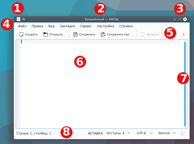Это окно текстового редактора KWrite. Выберите левой кнопкой мыши соответствующую часть окна, чтобы узнать о ней больше.
