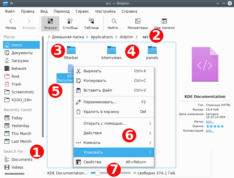 Это окно диспетчера файлов Dolphin. Выберите левой кнопкой мыши соответствующую часть окна, чтобы узнать о ней больше.