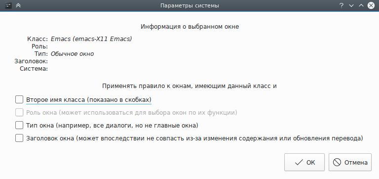 Нажмите кнопку Определение свойств окна и выберите окно программы Emacs. Задайте соответствие только по главному имени класса, оставив флажки неотмеченными (дополнительные сведения доступны в разделе Выбор окон):