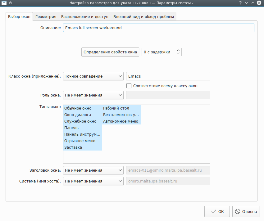 Если окно текстового редактора Emacs или gVim распахнуто (полноэкранный режим), при определённых условиях могут возникнуть проблемы, связанные с изменениемразмеров окна (дополнительные сведения: Emacs window resizes ...). Создание правила KWin позволяет обойти этот недостаток.