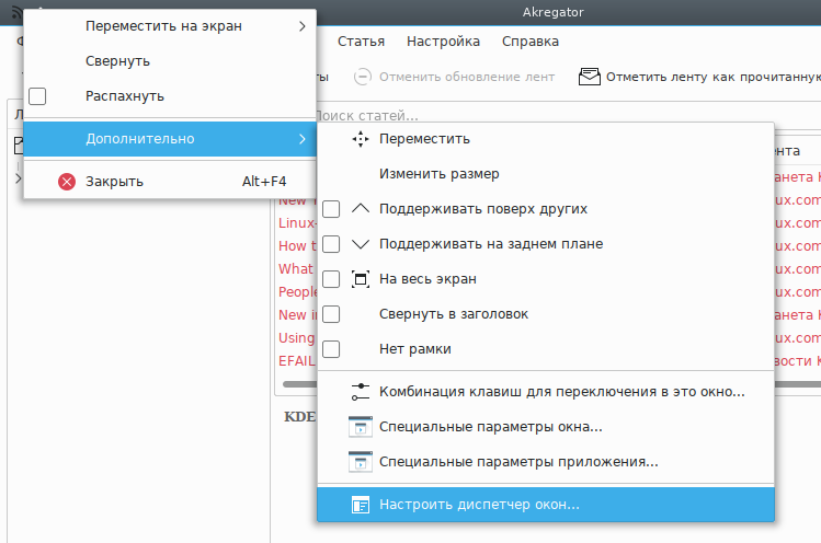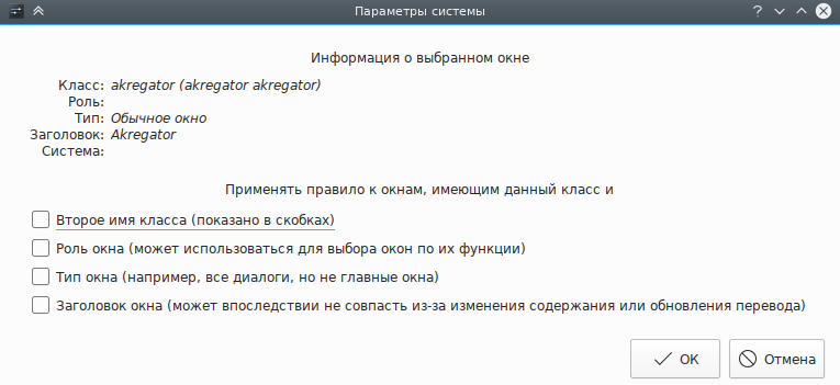 Нажмите кнопку Определение свойств окна с 0 с задержки: курсор сразу примет вид перекрестия. Щёлкните мышью внутри окна программы Akregator (по любому месту, кроме заголовка). Будет показано окно с критериями окна программы. Задайте соответствие только по главному имени класса, оставив флажки неотмеченными (дополнительные сведения доступны в разделе Выбор окон):