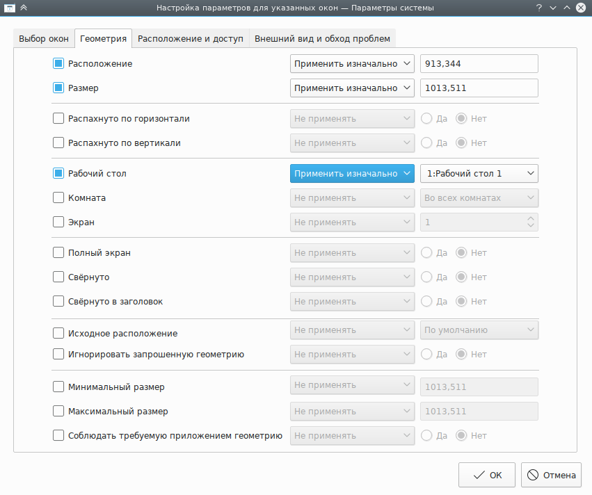 Включите атрибуты окна: Расположение, Размер и Рабочий стол. Исходные значения устанавливаются при помощи кнопки Определение свойств окна, их возможно переопределить: