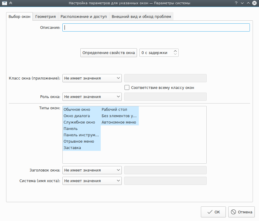 Нажмите кнопку OK, чтобы заполнить поля вкладки Выбор окон свойствами выбранного окна. Введите поясняющий текст в поле Описание (он будет показан в окне правила KWin):