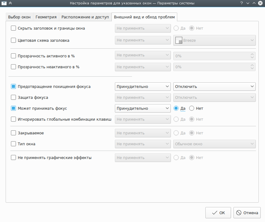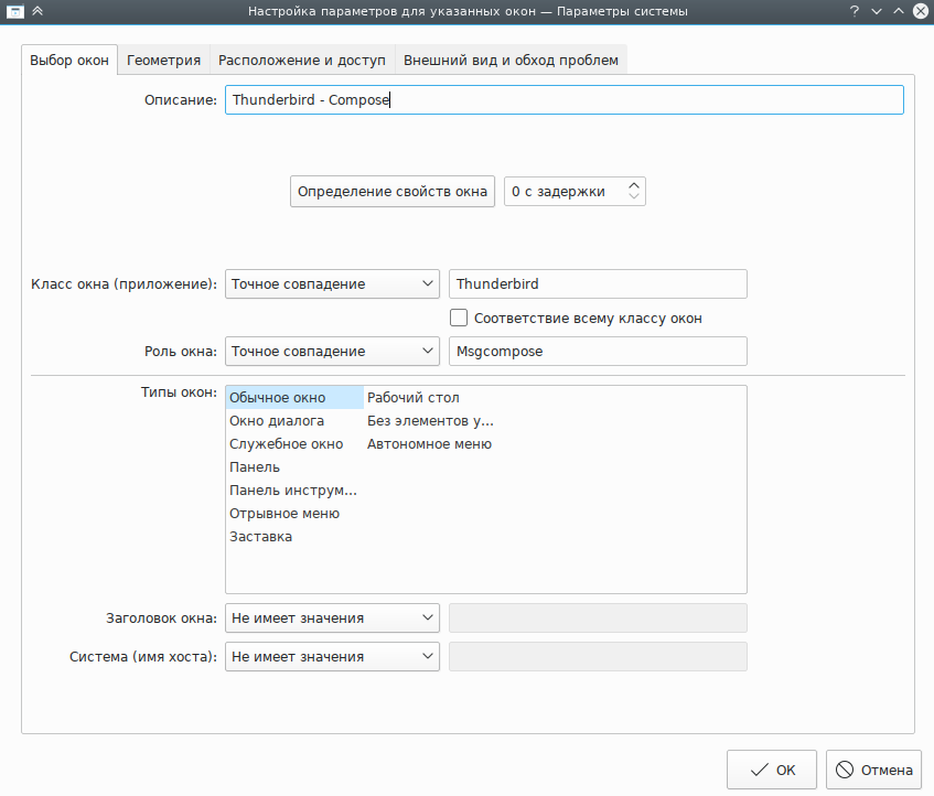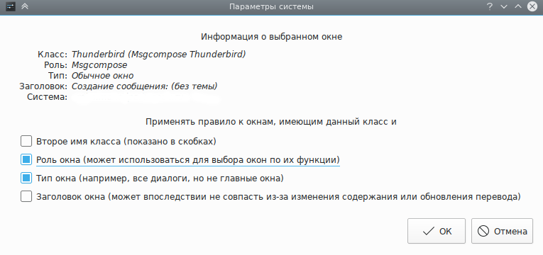 Нажмите кнопку Определение свойств окна и выберите Окно создания сообщения Thunderbird. Отметьте флажки Роль окна и Тип окна, чтобы ограничить применение критериев окнами создания сообщений (дополнительные сведения доступны в разделе Выбор окон):