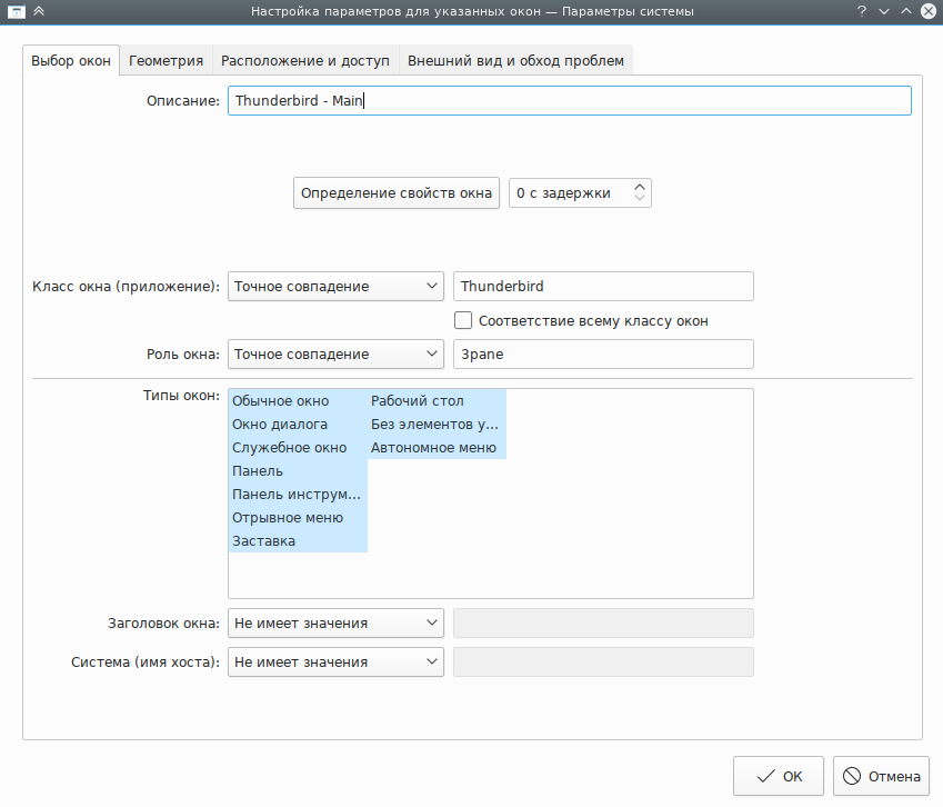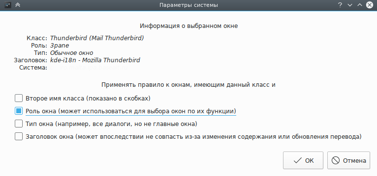 Нажмите кнопку Определение свойств окна и выберите окно Главное окно Thunderbird. Отметьте флажок Роль окна, чтобы ограничить применение критериев главным окном (дополнительные сведения доступны в разделе Выбор окон):
