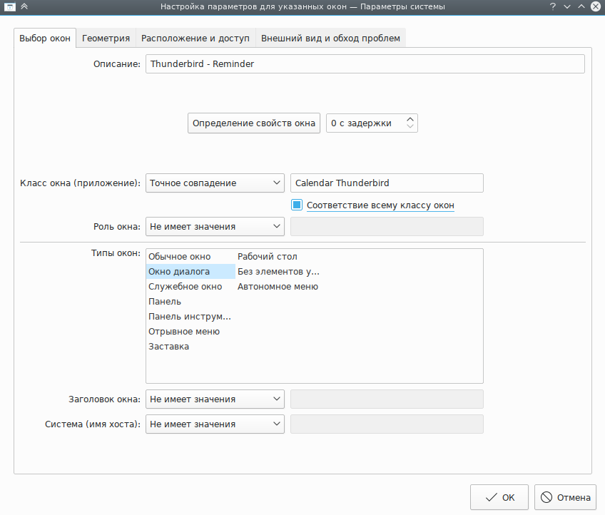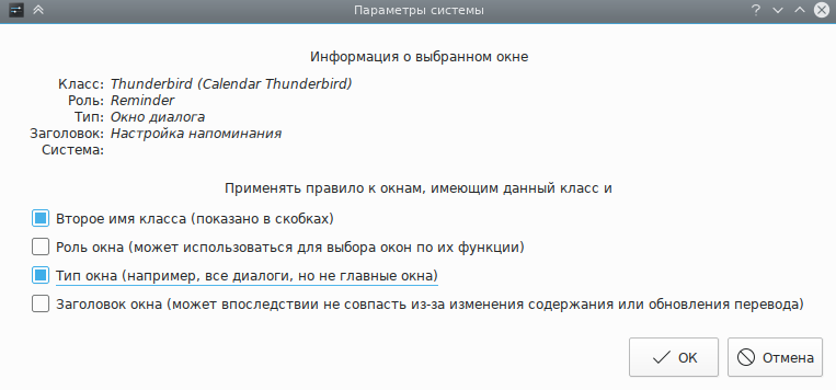 Нажмите кнопку Определение свойств окна и выберите Окно напоминания Thunderbird. Отметьте флажки Второе имя класса и Тип окна, чтобы ограничить применение критериев окнами напоминаний (дополнительные сведения доступны в разделе Выбор окон):