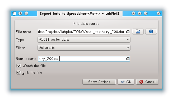 Det är möjligt att bara lagra länken till den externa filen i projektfilen och inte dess innehåll. Varje gång en projektfil öppnas i LabPlot, läses innehållet från den externa filen igen. Dessutom är det möjligt att låta LabPlot övervaka filen för ändringar: Innehållet i fildatakällan uppdateras om den externa filen har ändrats.