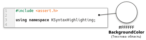 Кольорів у програмі для редагування тексту, зокрема на карті смужки гортання, у меню, на панелі вкладок, кольору вікна тощо. У програмах KDE, зокрема Kate або KDevelop, ці кольори визначаються