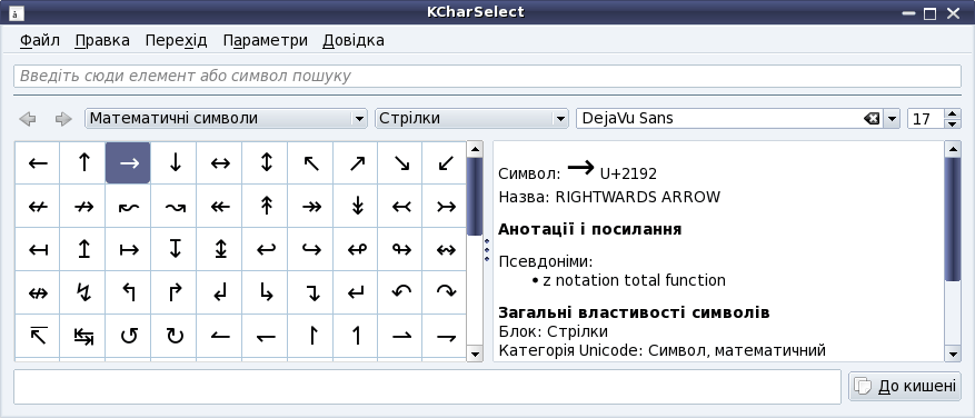 Ви можете переглядати символи за категоріями або швидко знайти певний символ за його назвою. Програма KCharSelect здатна показувати різноманітну інформацію щодо позначеного символу. Серед показаних даних буде не лише назва символу Unicode, але і його альтернативні назви, загальні нотатки та посилання на подібні символи.