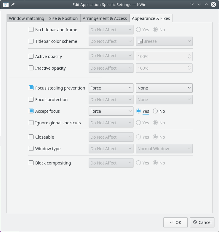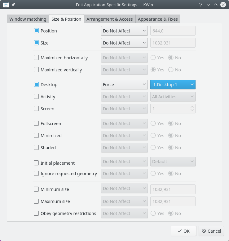 Всі критерій відповідності правила є достатньо строгими, отже їхній порядок у основному вікні KWin не є важливим для обробки правила.